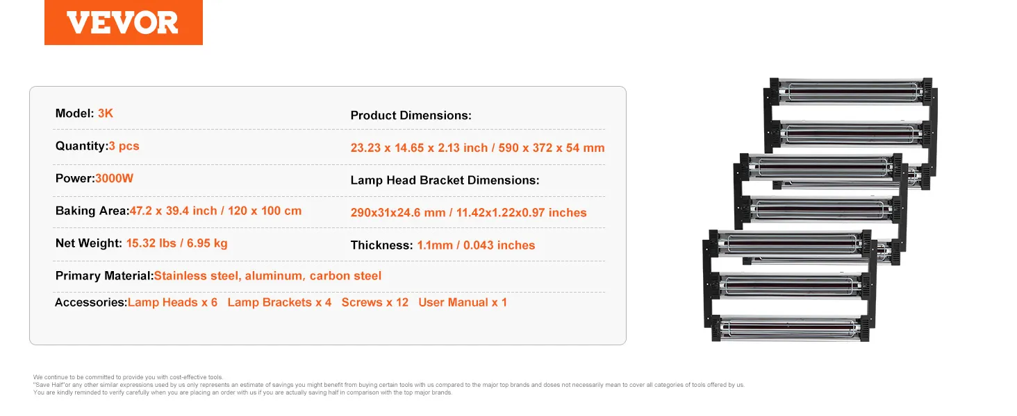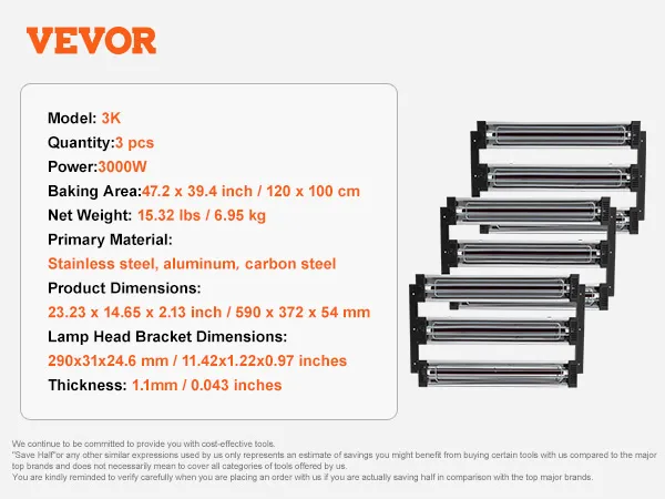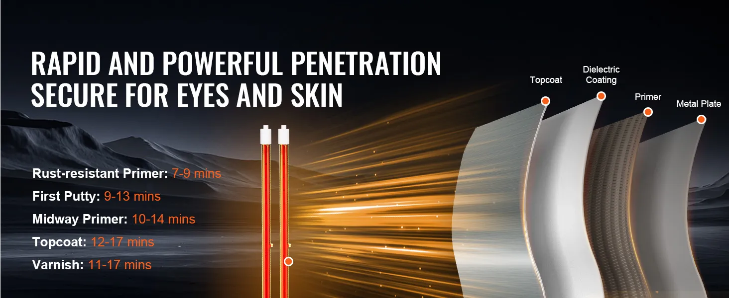 Large drying area: This electric paint dryer lamp can dry an area of 47.2 x 39.3 square inches / 120 x 100 cm². The working distance can be 23–31 inches / 600–800 mm, ensuring safe yet efficient operation.