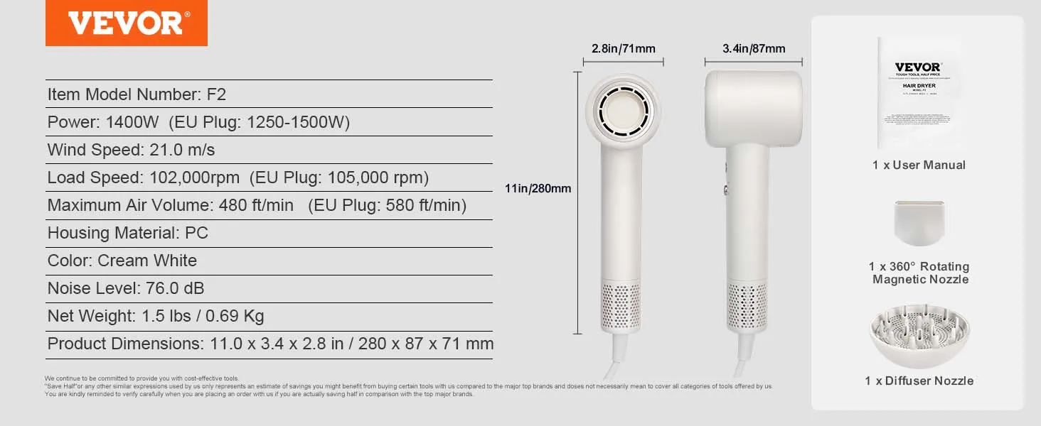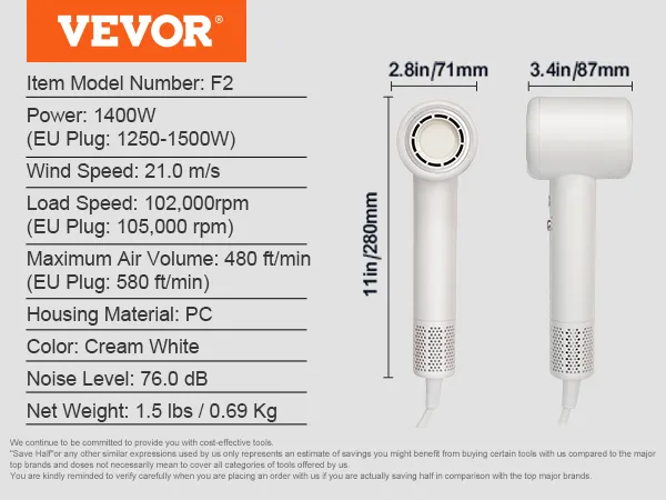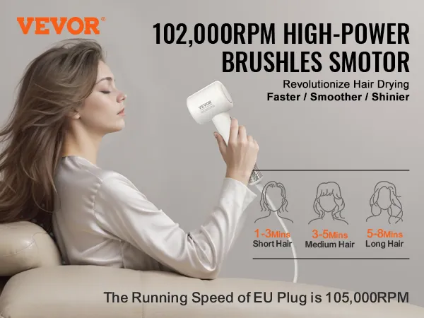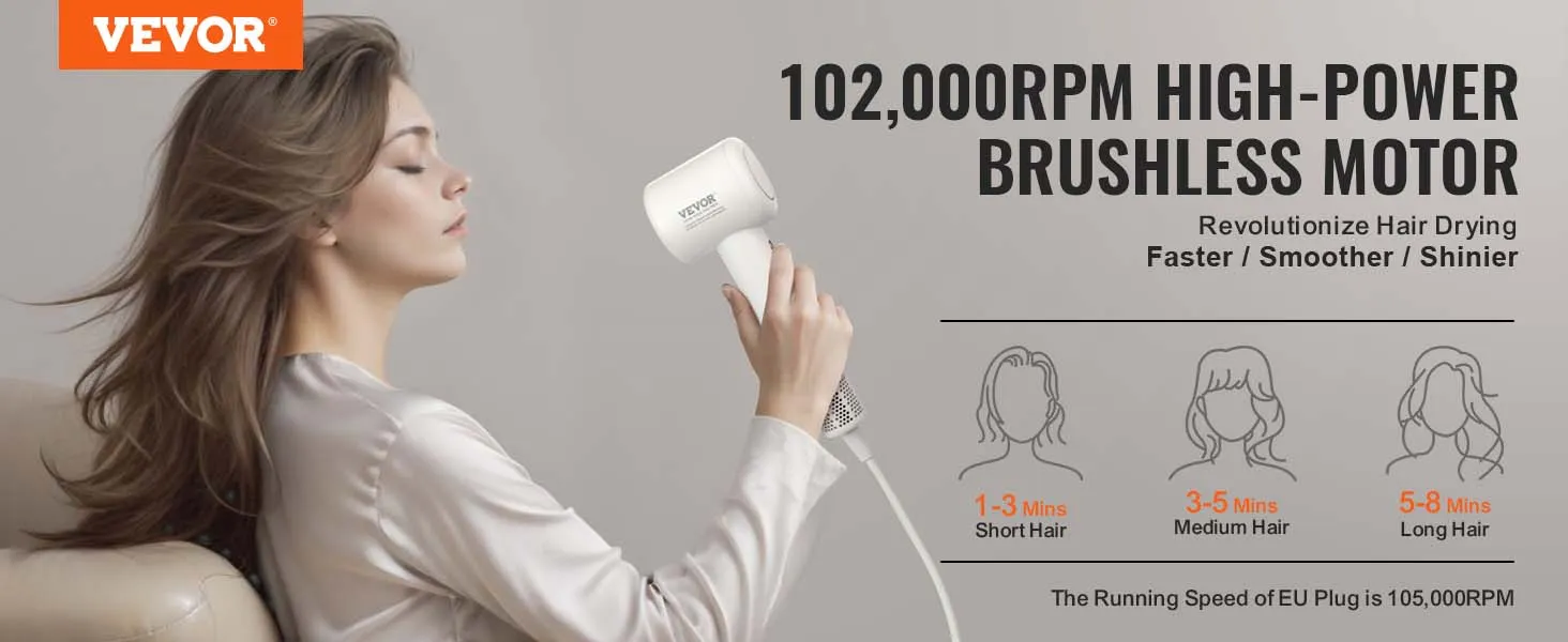 Secado de cabello más rápido con motor sin escobillas de alta velocidad: El secador de pelo VEVOR cuenta con un motor sin escobillas de alta velocidad de 105.000 RPM, que proporciona una fuerte velocidad del viento de hasta 21,0 m/s y un volumen de aire máximo de 580 pies/min. Disfrute de un secado más rápido mientras protege su cabello del daño causado por el calor excesivo.