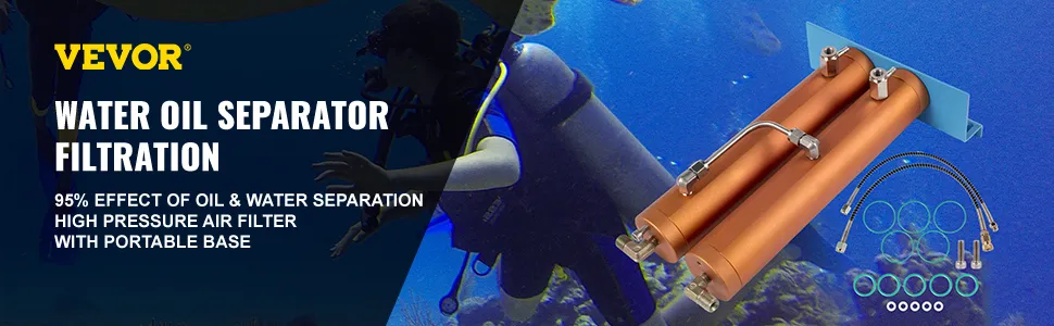 El separador de agua y aceite está hecho de una carcasa de aleación de aluminio de grado aeronáutico con una base para mayor durabilidad y estabilidad. Cuenta con un sistema de filtrado de segundo grado que permite filtrar el 95% del agua y el aceite. Es compatible con muchos tipos de compresores de aire, como los de buceo.