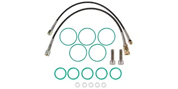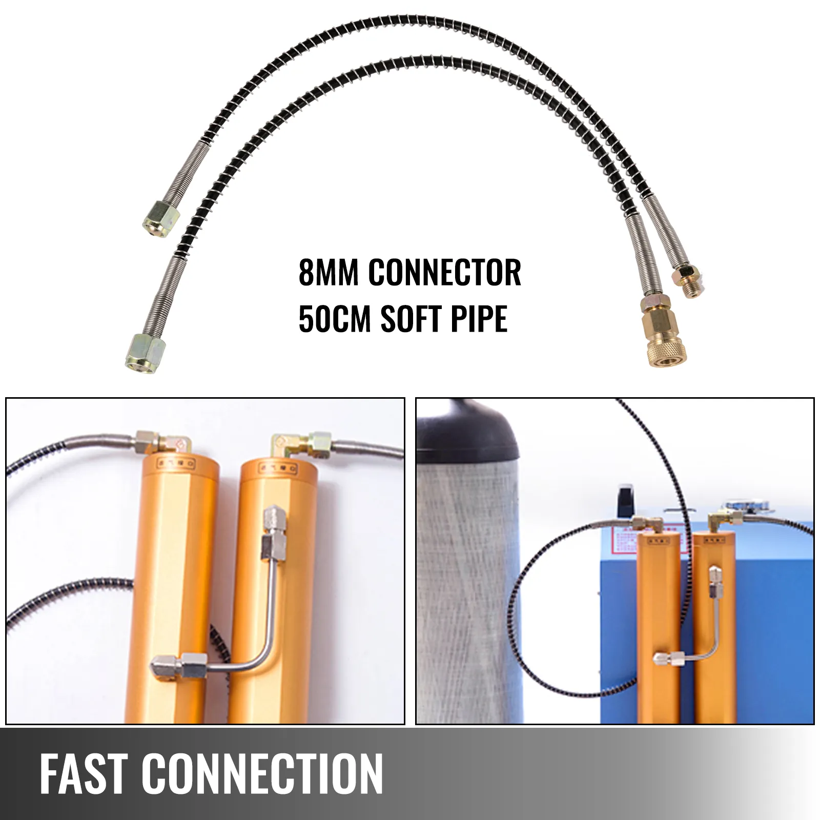 El separador de aceite y agua incluye dos mangueras de alta presión de 50 cm con resorte y conector de 8 mm. Diseñado para conexión fácil y rápida.