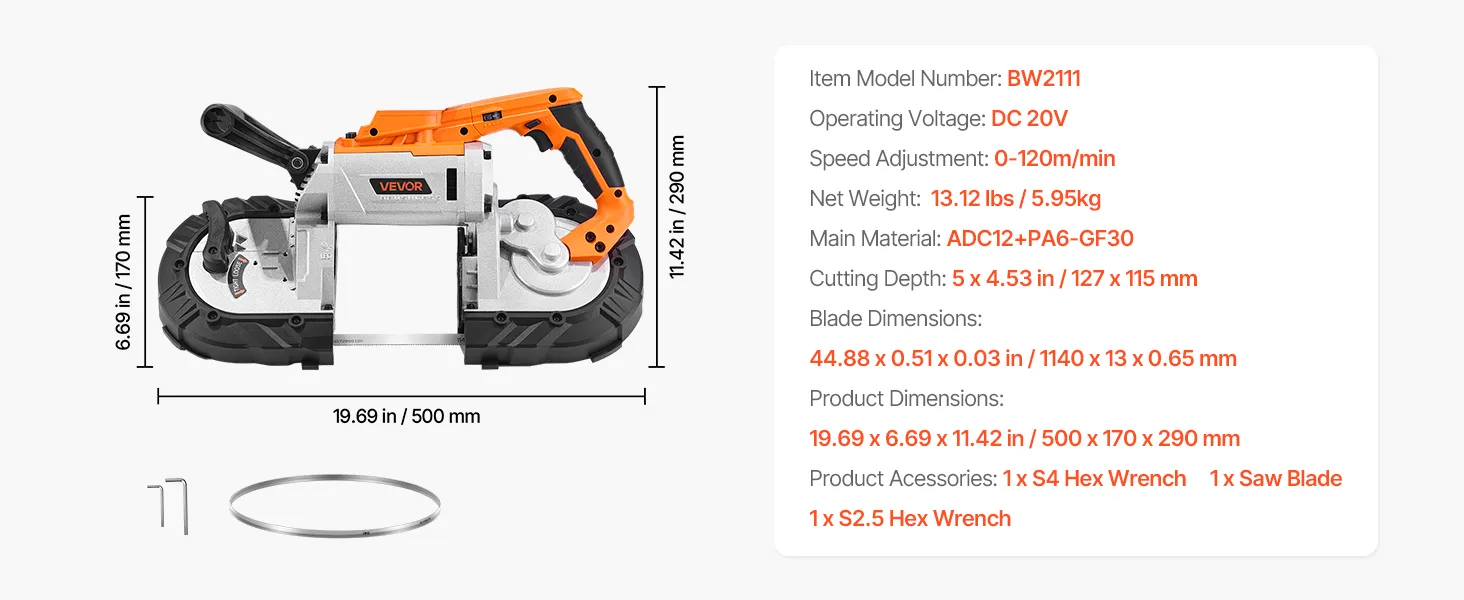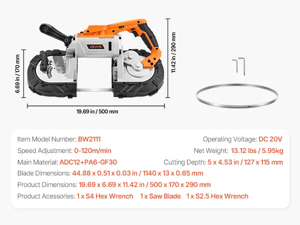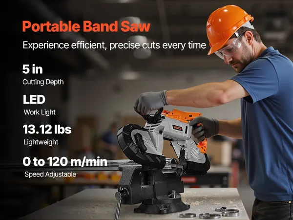 Profundidad de corte de hasta 5 pulgadas: Esta sierra de cinta portátil es ideal para trabajos pesados y cortes de piezas grandes. Equipada con una hoja de 10/14 T, corta eficientemente hasta 1140 x 13 x 0,65 mm, lo que la hace ideal para trabajos pesados con facilidad