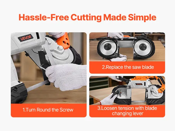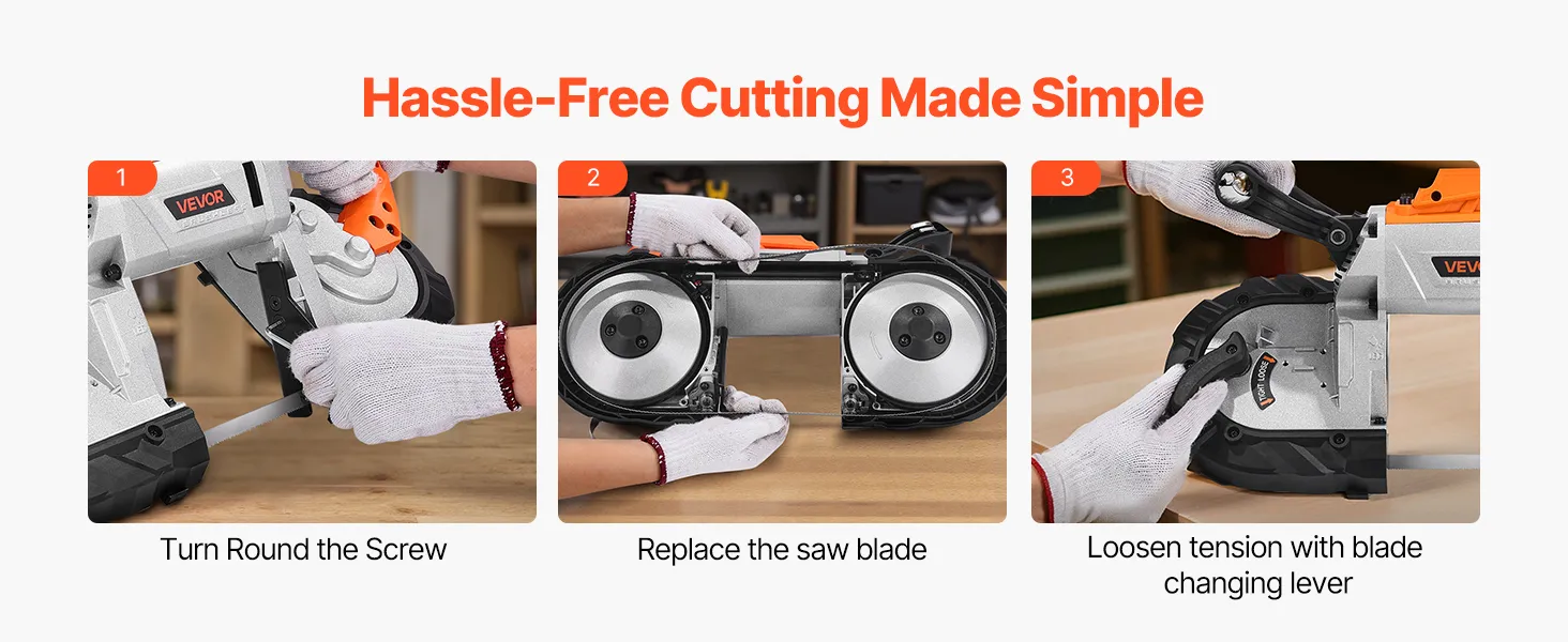Cambie las hojas en segundos. Simplemente gire el tornillo y listo. Esta sierra de cinta portátil incluye una práctica llave para hojas, así que no necesita herramientas adicionales. Los cambios rápidos significan menos tiempo de inactividad y más tiempo para cortar.