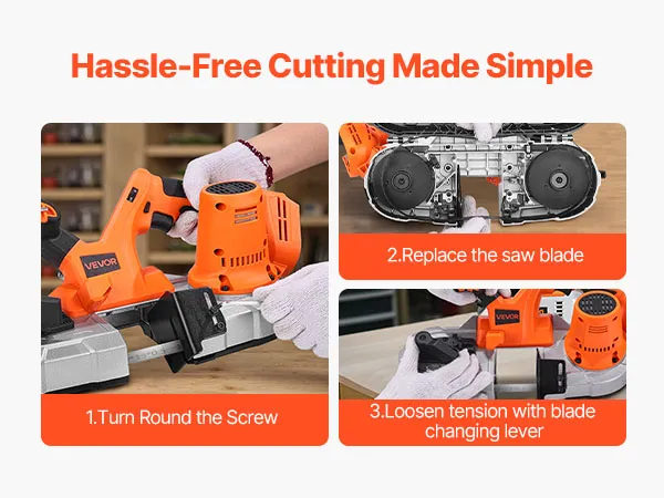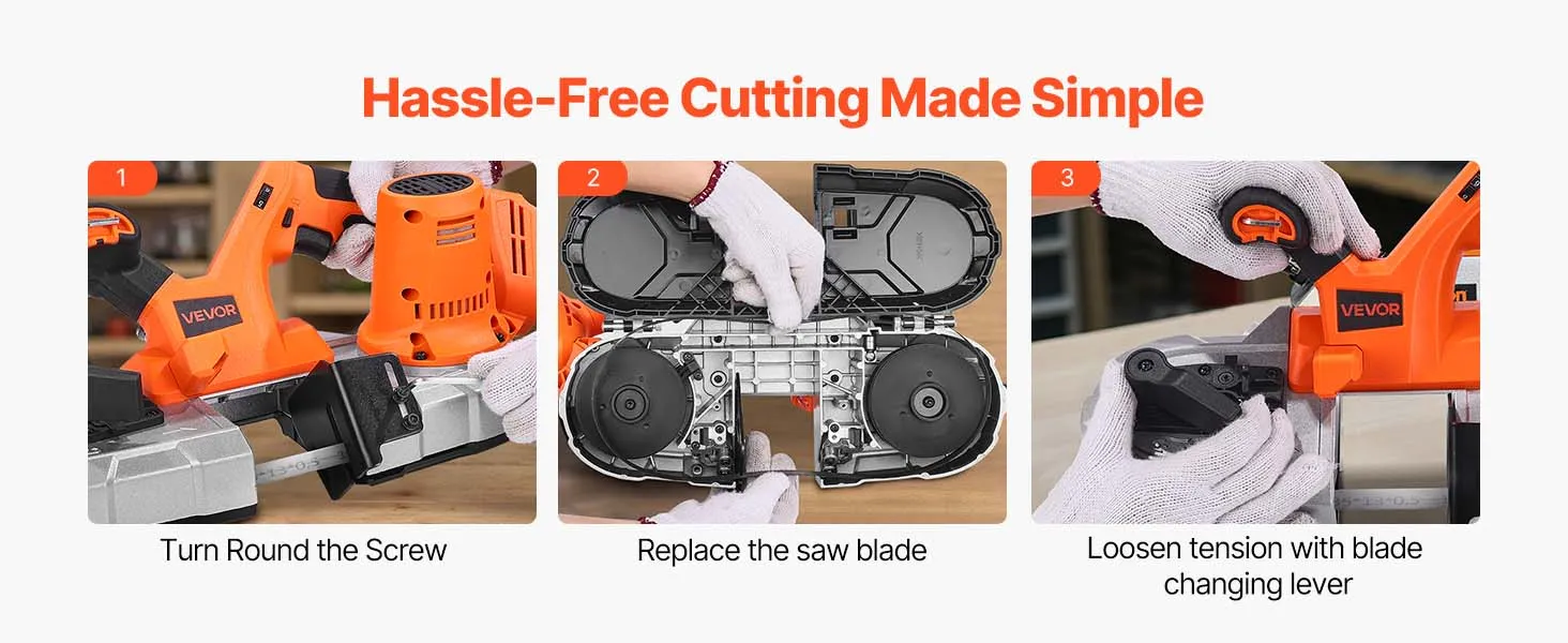Cambie las hojas en segundos. Simplemente gire el tornillo y listo. Esta sierra de cinta portátil incluye una práctica llave para hojas, así que no necesita herramientas adicionales. Los cambios rápidos significan menos tiempo de inactividad y más tiempo cortando.