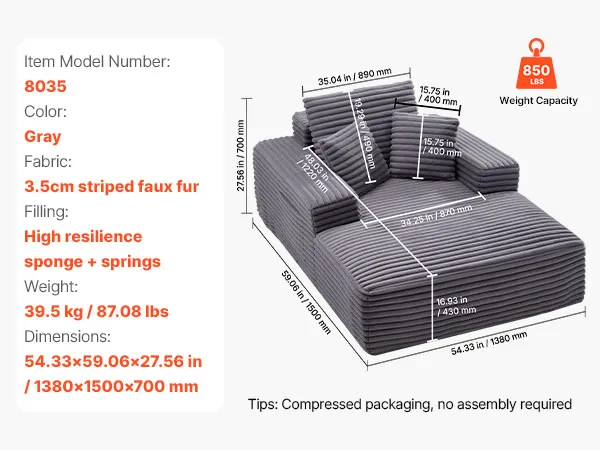VEVOR Chaise Longue Relajante, Sofá Cama Tapizado con Cojines Decorativos y Reposabrazos, con Asiento Profundo para Salón y Dormitorio, Esponja Altamente Elástica, 1380 x 1500 x 700 mm, Gris
