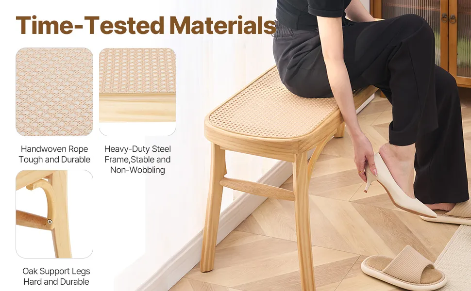 El banco de ratán cuenta con un asiento de cuerda tejida resistente que no se comba. Su estructura de madera maciza y sus patas de roble pulido garantizan la estabilidad. Soporta hasta 250 libras, tiene capacidad para dos adultos cómodamente y es ideal para dormitorios, entradas.