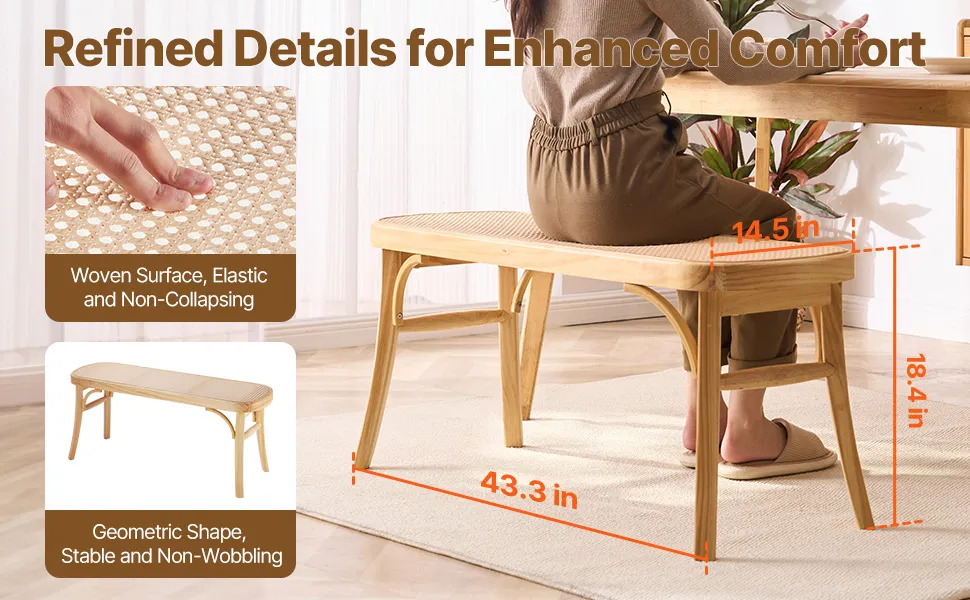 Comodidad y estabilidad: Este banco tejido ofrece comodidad y soporte, soporta hasta 250 libras y puede acomodar fácilmente a dos adultos. Su ingenioso diseño geométrico de patas distribuye el peso de manera uniforme para evitar que se vuelque, mientras que el espacioso asiento de ratán es cómodo y flexible, lo que le permite relajarse como desee