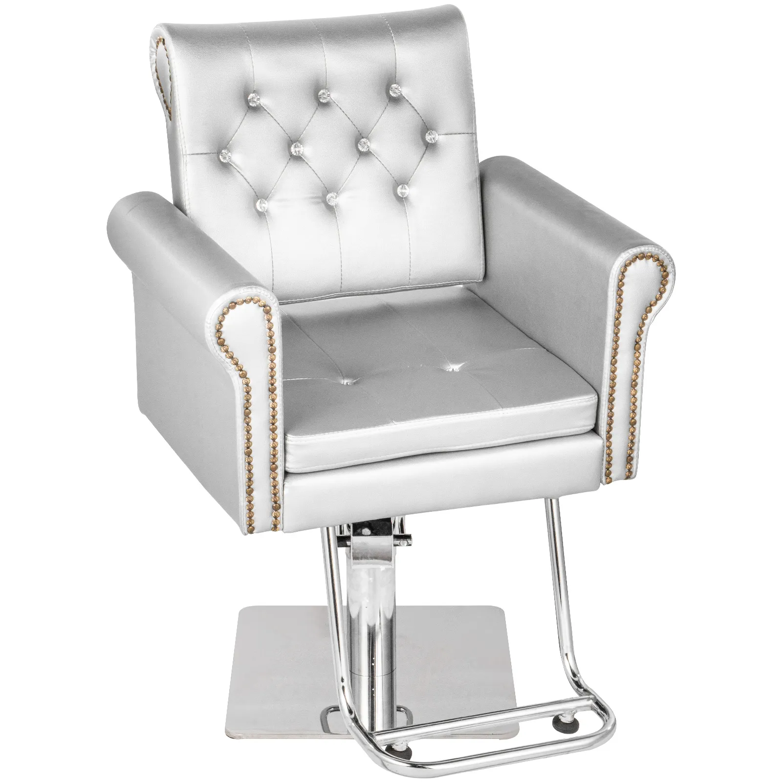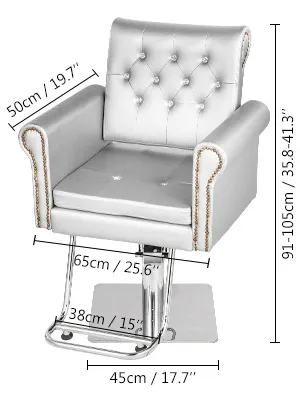 Esta silla de peluquería está diseñada con un aspecto y color clásico. Sin embargo, es bastante moderno con cuentas tapizadas brillantes y botones de bronce.