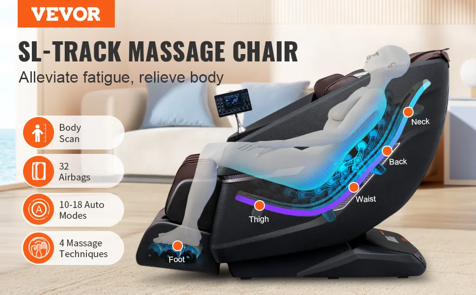 Sillón de masaje VEVOR con riel SL flexible, sillón reclinable de gravedad cero de cuerpo completo, 10-18 modos automáticos, Shiatsu 3D, calefacción, altavoz Bluetooth, bolsa de aire, rodillo para pies y pantalla táctil