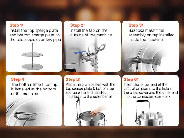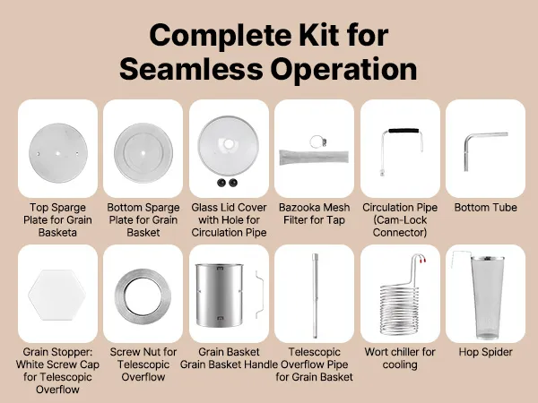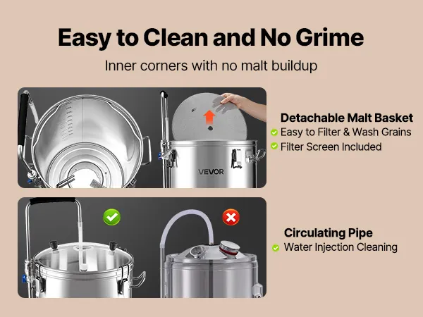 Materiales de alta calidad: Las partes de la olla de cocción que entran en contacto con el mosto están fabricadas en acero inoxidable 304 apto para uso alimentario (0,5 mm de espesor). La cesta de filtro extraíble evita la acumulación de residuos y el brazo de recirculación permite una limpieza a fondo, garantizando que cada cerveza se mantenga pura y aromática