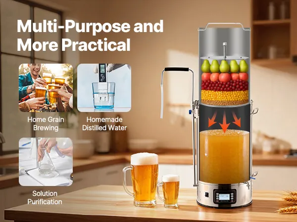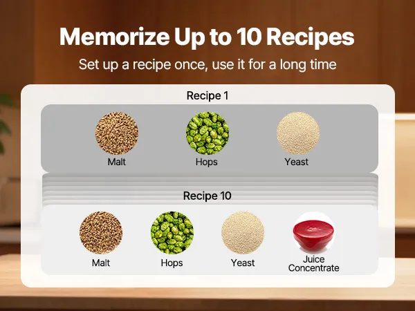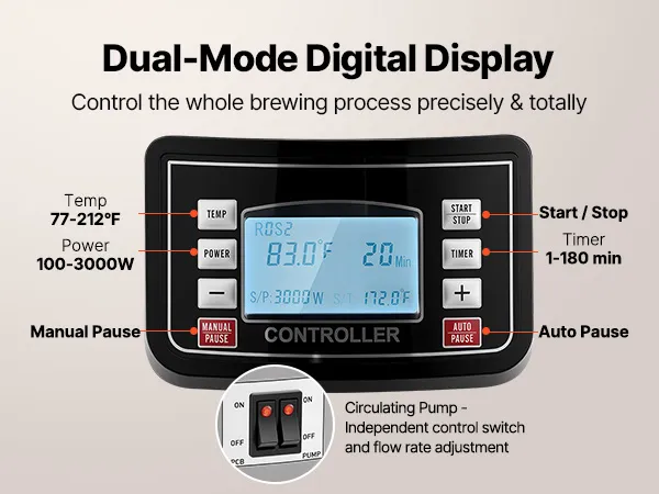 Fácil de usar: Una pantalla LCD inteligente permite ajustar la potencia (100–1800 W), la temperatura (25–100 °C) y el tiempo (1–180 min). Almacena diez recetas y te avisa cuándo añadir lúpulo, garantizando que cada lote sea consistente o completamente nuevo