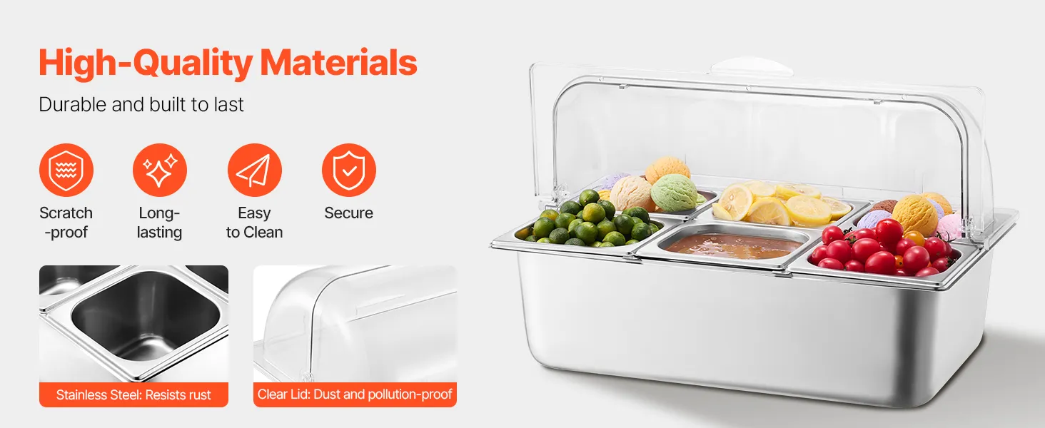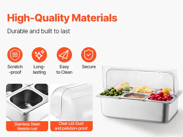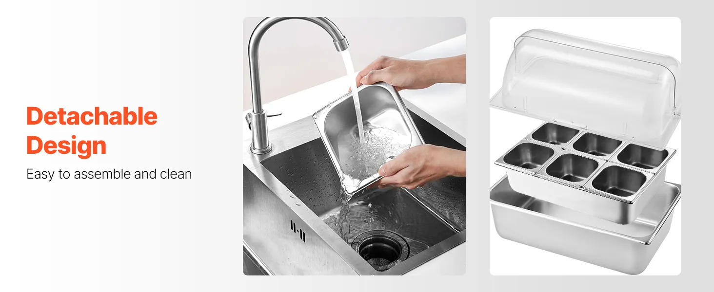 Materiales de primera calidad: Tanto la bandeja para alimentos como la bandeja para agua de nuestro recipiente para exhibición de alimentos para mostrador están hechas de acero inoxidable de alta calidad apto para uso alimentario, que cumple con los estándares de seguridad y tiene una durabilidad excepcional. Están diseñadas para ser desmontables para una fácil limpieza y reensamblaje, lo que garantiza un uso duradero