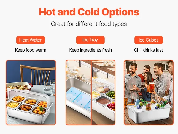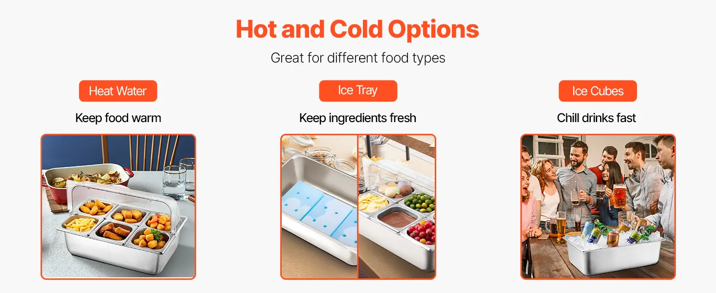 Nuestro recipiente para servir alimentos tiene un espacio en la parte inferior exclusivo para colocar agua caliente, bandejas de hielo o cubitos de hielo, lo que mantiene los alimentos a su temperatura ideal durante más tiempo.