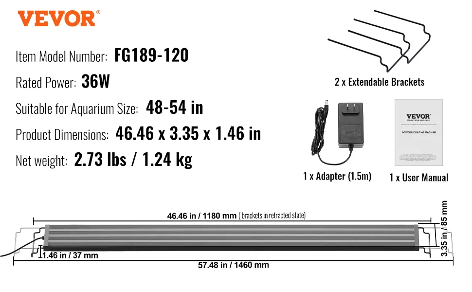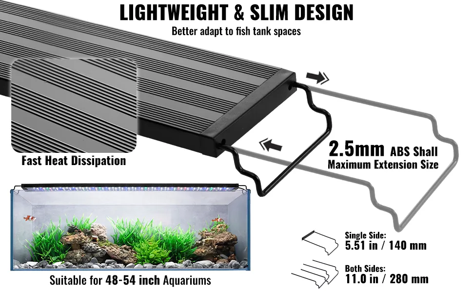 Amplias aplicaciones: diseñadas para acuarios de 48 a 54 pulgadas, las luces LED para acuarios VEVOR tienen 2 soportes extensibles con una extensión máxima de un solo lado de 5,5 pulgadas y una extensión de doble lado de 11 pulgadas, lo que las hace fáciles de instalar en la mayoría de los tanques de acuario de vidrio o acrílico. Con capota/tapa transparente o no, con o sin reborde. Adecuado tanto para principiantes como para entusiastas de los acuarios experimentados.