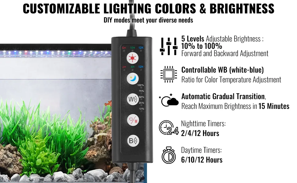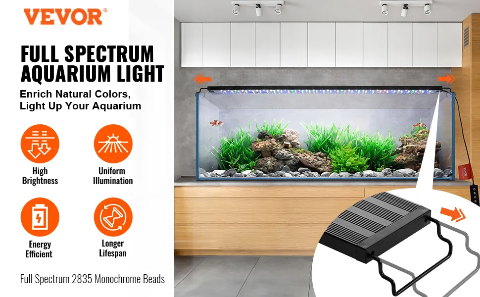 Iluminación vibrante, belleza natural revelada: con LED monocromáticos 2835 de cinco filas de espectro completo, 5 niveles de brillo, temporizador ajustable, la luz del acuario VEVOR ofrece alto brillo, iluminación uniforme y eficiencia energética.