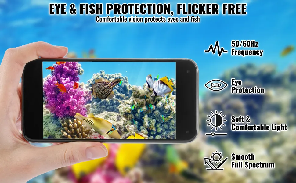 Diga adiós a las luces parpadeantes que incomodan a sus peces y observadores. Nuestra luz LED para acuario emite una iluminación suave y sin parpadeos con un espectro suave, proporcionando un ambiente cómodo para sus peces y al mismo tiempo le permite admirar el mundo submarino.