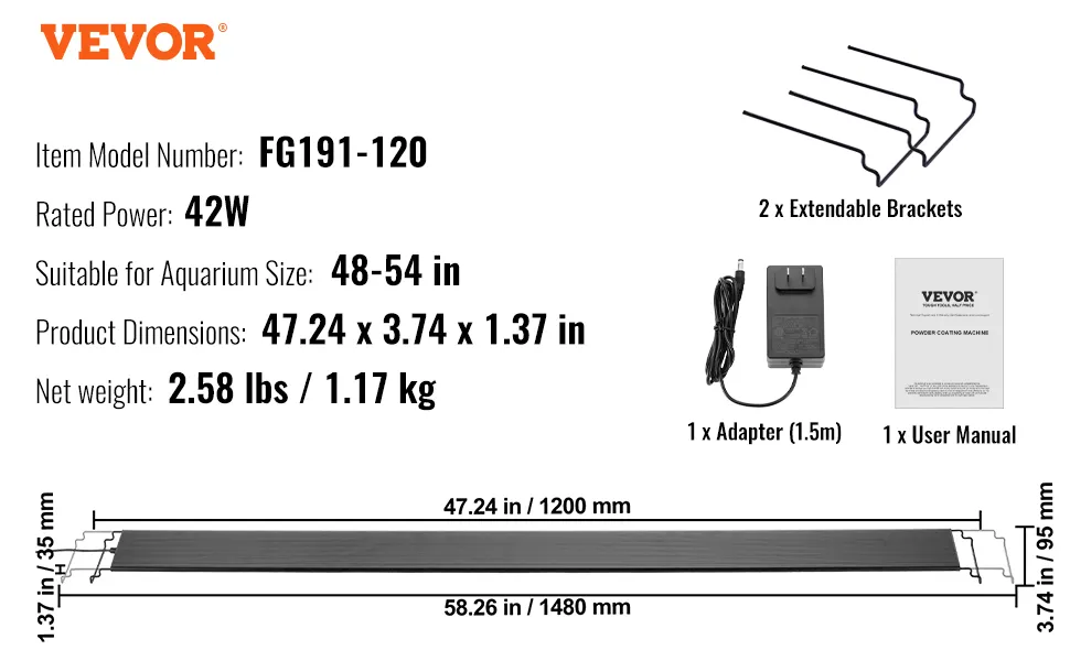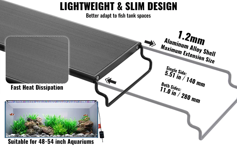 Amplias aplicaciones: diseñadas para acuarios de 48 a 54 pulgadas, las luces LED para acuarios VEVOR tienen 2 soportes extensibles con una extensión máxima de un solo lado de 5,5 pulgadas y una extensión de doble lado de 11 pulgadas, lo que las hace fáciles de instalar en la mayoría de los tanques de acuario de vidrio o acrílico. Con capota/tapa transparente o no, con o sin reborde. Adecuado tanto para principiantes como para entusiastas de los acuarios experimentados.