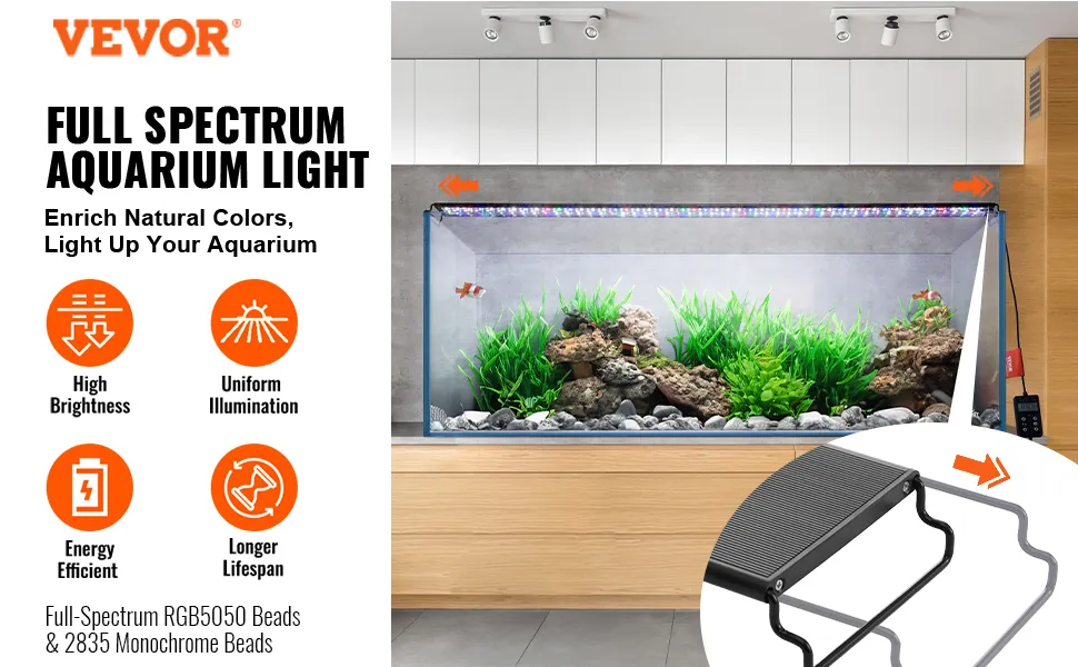 Despierta los colores y abraza la belleza de la naturaleza. La luz para acuario VEVOR cuenta con LED RGB5050 de alto espectro de lúmenes y 2835 LED monocromáticos, que brindan una iluminación vibrante y uniforme al tiempo que conservan energía.