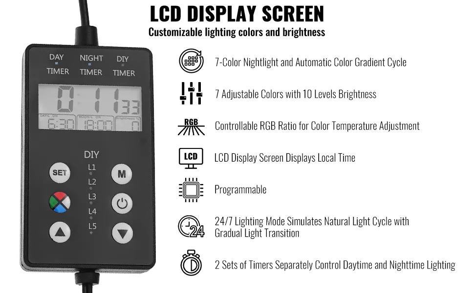 Configuraciones personalizables con monitor LCD: tiene la libertad de ajustar el color, el brillo y la relación RGB de las luces según sus preferencias. Disfrute de una iluminación nocturna de 7 colores y un ciclo de color gradual automático, con opciones para establecer 10 niveles de brillo y controlar las proporciones RGB. Con función programable, creando la iluminación perfecta para corales o peces, promoviendo la fotosíntesis y el crecimiento de plantas acuáticas.