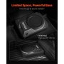 Delgado y compacto: Nuestro subwoofer de 3,3 pulgadas/85 mm para debajo del asiento del automóvil, con un amplificador incorporado, se adapta perfectamente debajo del asiento del automóvil, lo que maximiza el espacio y mejora el sistema de audio del automóvil. Disfrute de graves profundos y potentes y una calidad de sonido envolvente, lo que hace que cada viaje sea más placentero