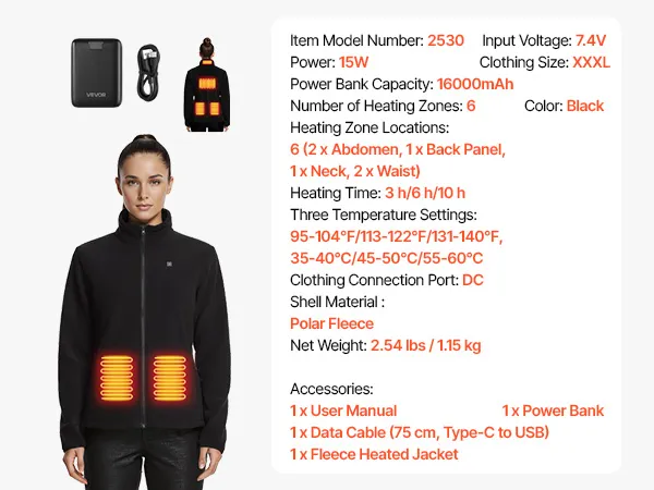 VEVOR Chaqueta Polar Calefactable para Mujer, con Batería Externa Recargable 7,4 V y 16 000 mAh, 6 Zonas de Calentamiento, 3 Niveles de Temperatura, 3 h/6 h/10 h de Calor, Color Negro, Talla XXXL