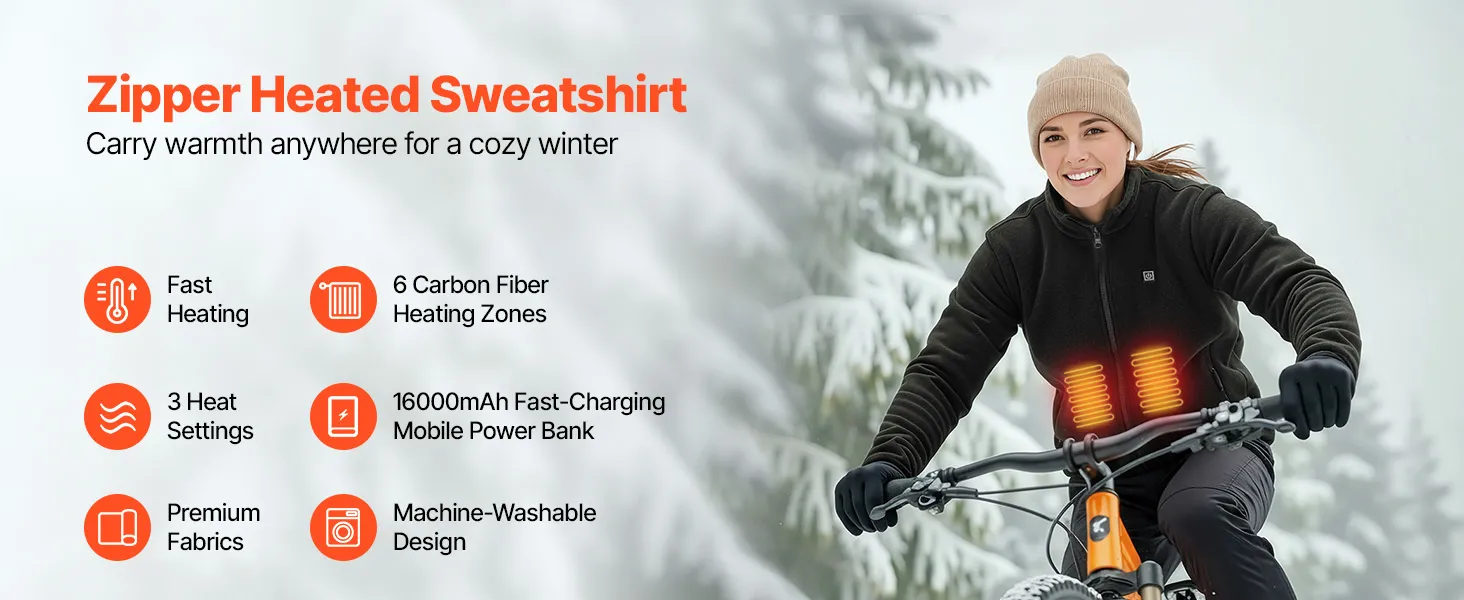 Esta sudadera calefactable cuenta con 6 zonas de fibra de carbono para un calor rápido y uniforme. Ofrece tres niveles de temperatura ajustables y una batería externa de carga rápida de 16 000 mAh.