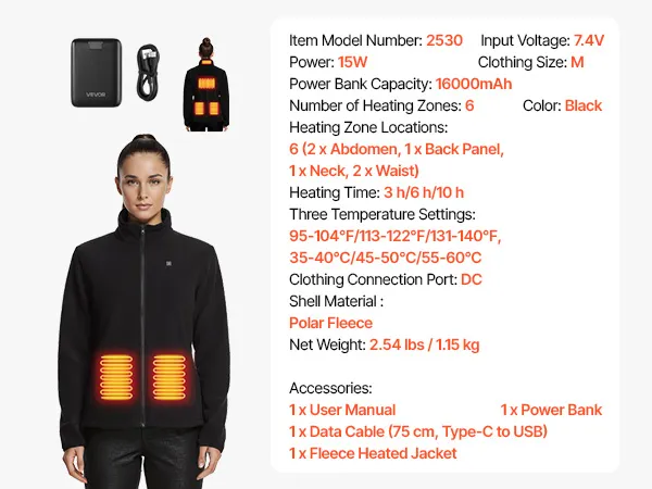VEVOR Chaqueta Polar Calefactable para Mujer, con Batería Externa Recargable de 7,4 V y 16 000 mAh, 6 Zonas de Calentamiento, 3 Niveles de Temperatura, 3 h/6 h/10 h de Calor, Color Negro, Talla M