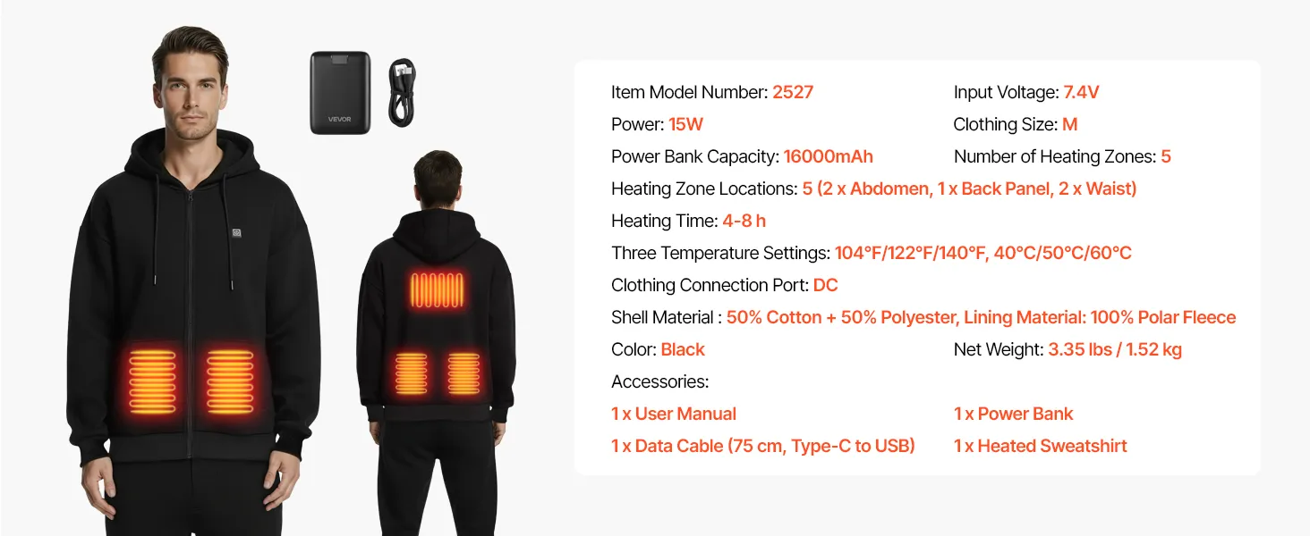 Cómoda y resistente: Nuestra sudadera con capucha calefactable cuenta con una capa exterior de mezcla de algodón y poliéster resistente a las arrugas y una capa interior de forro polar. Su acabado antiestático facilita su colocación, mientras que la suave cremallera YKK garantiza un uso duradero