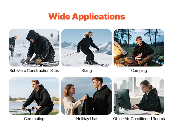 Nuestra sudadera con capucha calefactable cuenta con una batería externa de 16000 mAh con carga rápida, que proporciona una larga duración. Con una salida de 7,4 V/15 W, no solo mantiene la sudadera calefactable abrigada, sino que también carga tus dispositivos electrónicos durante el viaje.