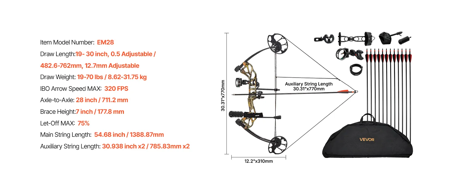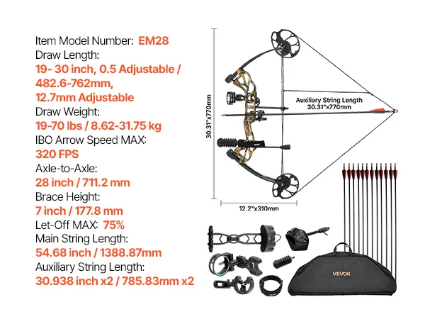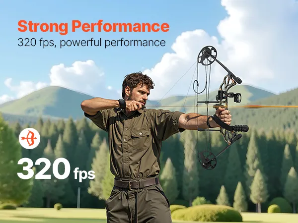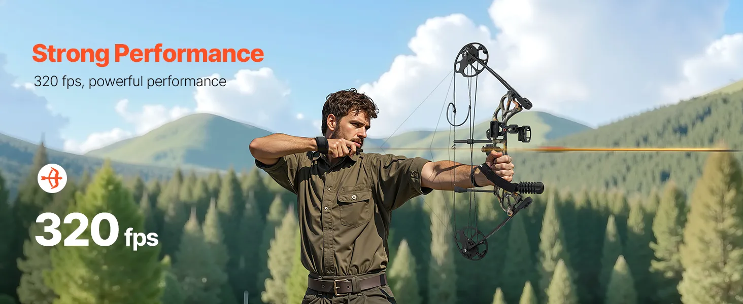 Rendimiento fuerte y excepcional: Con una longitud de eje a eje de 711,2 mm cuidadosamente diseñada y una velocidad de flecha de 320 FPS, este kit de arco de caza ofrece un excelente letoff y potencia, lo que garantiza estabilidad y fuerza durante el disparo