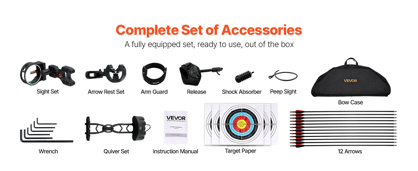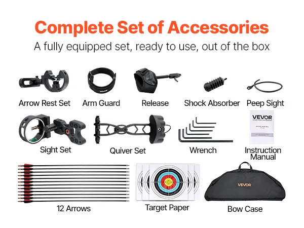 Accesorios completos y prácticos: El paquete de arco compuesto incluye una variedad de accesorios prácticos, como diferentes tipos de flechas, una mira y más. Estos accesorios mejoran tanto la precisión como la estética de tu experiencia con el arco