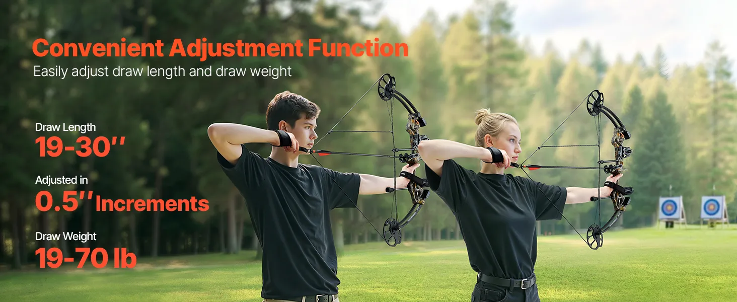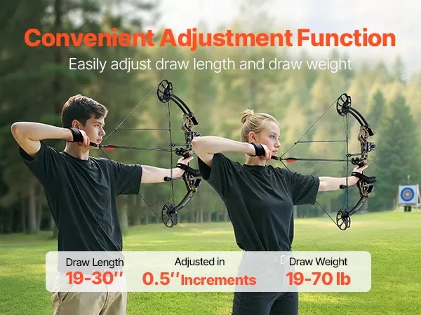 Ajuste práctico: La longitud de tiro se puede ajustar entre 48 y 76 cm en incrementos de 1,27 cm, y la fuerza de tiro puede variar fácilmente entre 8 y 32 kg. Tanto principiantes como arqueros experimentados encontrarán rápidamente la configuración adecuada