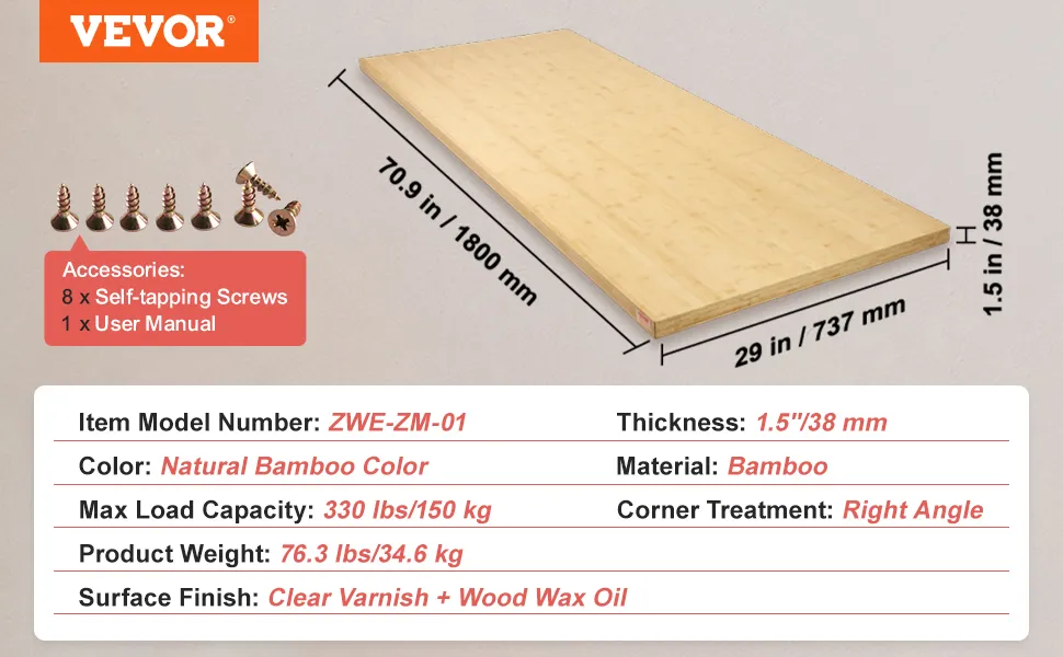El tablero de bambú de VEVOR tiene una construcción de primera calidad con un acabado de barniz suave y aceite de cera para madera. Este acabado no solo realza la belleza natural del bambú, sino que también lo protege del desgaste. La superficie es lisa, con un brillo que facilita su limpieza y mantenimiento. Los bordes y las esquinas están bien lijados, lo que garantiza una experiencia de usuario segura y cómoda. ¡Un acabado impecable le da un aspecto de primera calidad, lo que lo convierte en una excelente incorporación a cualquier espacio!