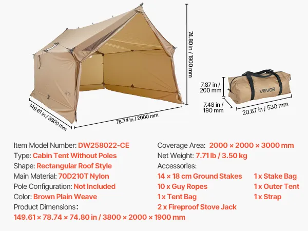 VEVOR Tienda de Campaña Caliente para 2 Personas, Carpa Portátil Tipo Casa 380 x 200 x 190 cm con Orificio para Estufa, Tienda Impermeable para Acampar, Senderismo, Caza, Pesca y Mochilero