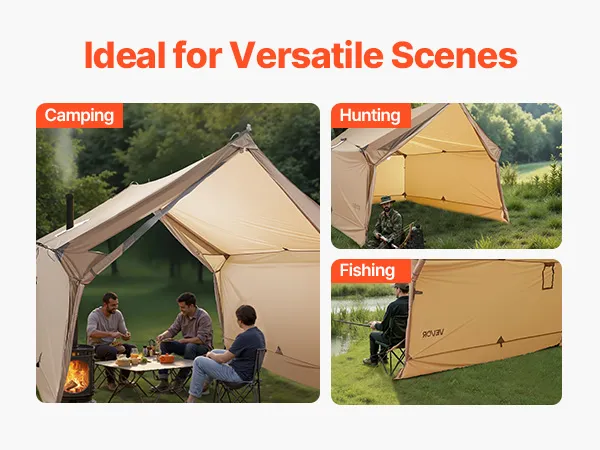 Interior espacioso: Nuestra tienda de campaña tipo cabaña con amplio espacio interior puede alojar cómodamente a varias personas. Es un refugio ideal para las cuatro estaciones, ideal para acampar en familia o en grupo