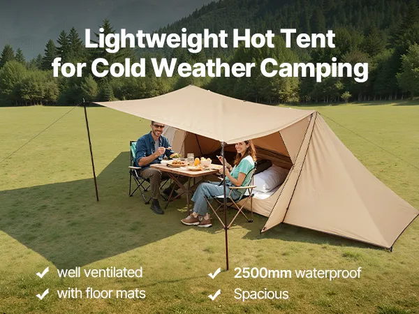 Diseño de puerta de doble capa: Equipada con una puerta de tela y una malla, esta tienda de campaña con entrada para estufa cuenta con un sistema de doble puerta. La capa de tela bloquea el viento, la lluvia y la nieve para conservar el calor, mientras que la capa de malla impide la entrada de moscas y permite la circulación del aire. Puede cambiar fácilmente entre ellas según el clima y sus necesidades