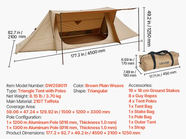 VEVOR Tienda de Campaña Caliente para 2 Personas, Carpa Portátil Triangular 330 x 150 x 120 cm con Soporte para Estufa y 2 Postes de Lona, Tienda Impermeable para Acampar, Caza, Pesca y Mochilero