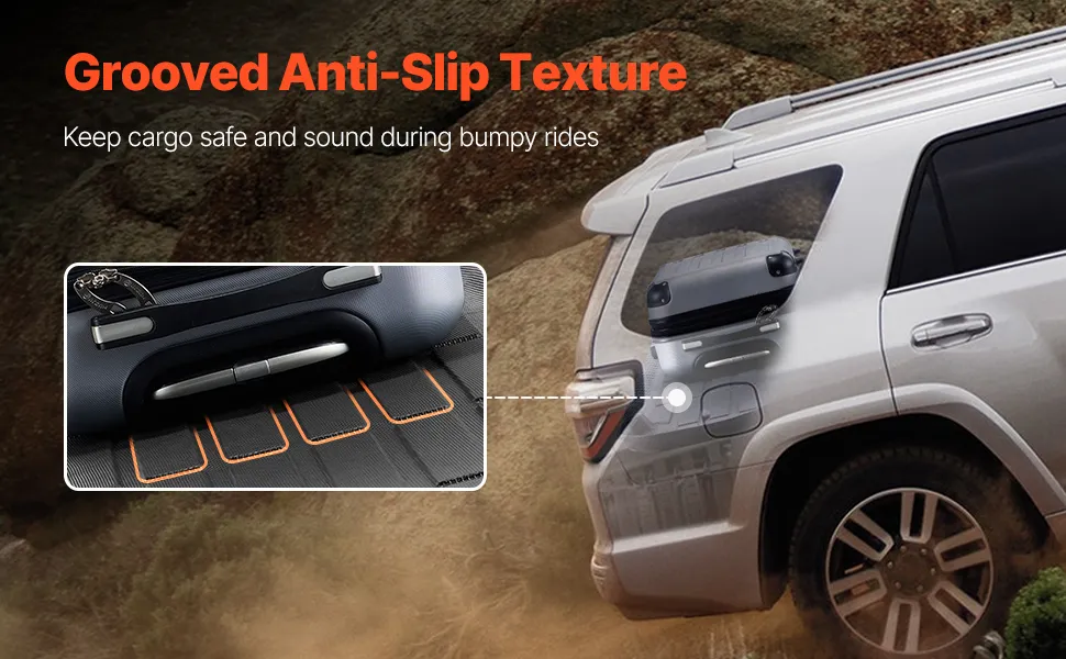 Superficie antideslizante: Las innovadoras ranuras 3D aumentan significativamente la fricción, ayudan a que su carga se mantenga segura contra deslizamientos durante el transporte y le brindan la confianza de que sus artículos están seguros durante todo el viaje