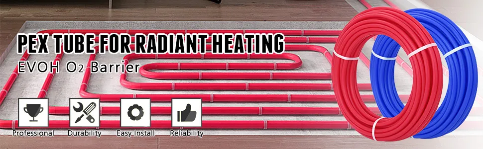 La tubería PEX de 1/2 "y 100 pies(30m) se usa comúnmente para sistemas de plomería, radiantes e hidrónicos. Es rápida de instalar, flexible y también se usa en líneas de agua potable fría / caliente. La capa de barrera de oxígeno EVOH evita que el O2 penetre en el sistema de tuberías.