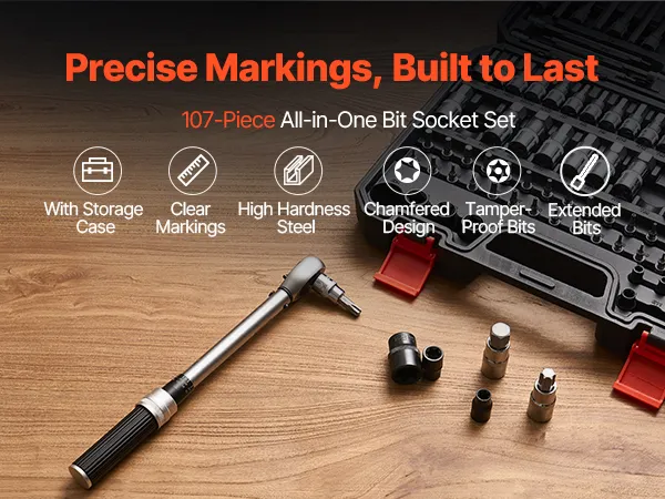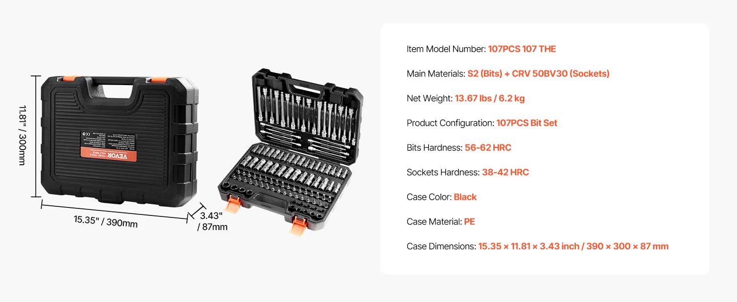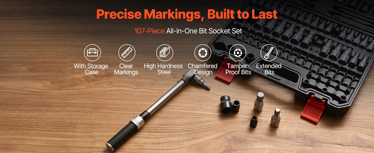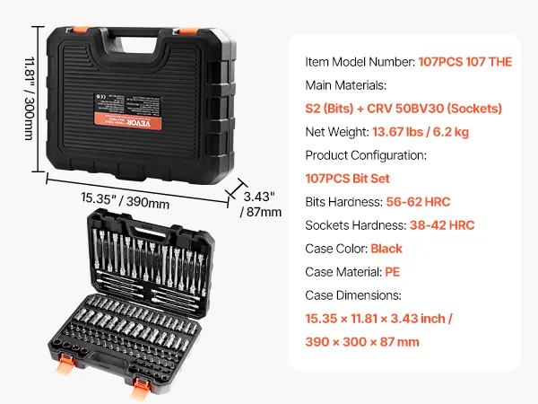 VEVOR 107 PCS Juego de Vasos con Punta, SAE y Métricos, Hexagonales/Torx/Torx Externo/a Prueba de Manipulaciones/Extralargos, Acero de Aleación S2 y Acero Cr-V, con Impulsores de 1/4", 3/8" y 1/2"