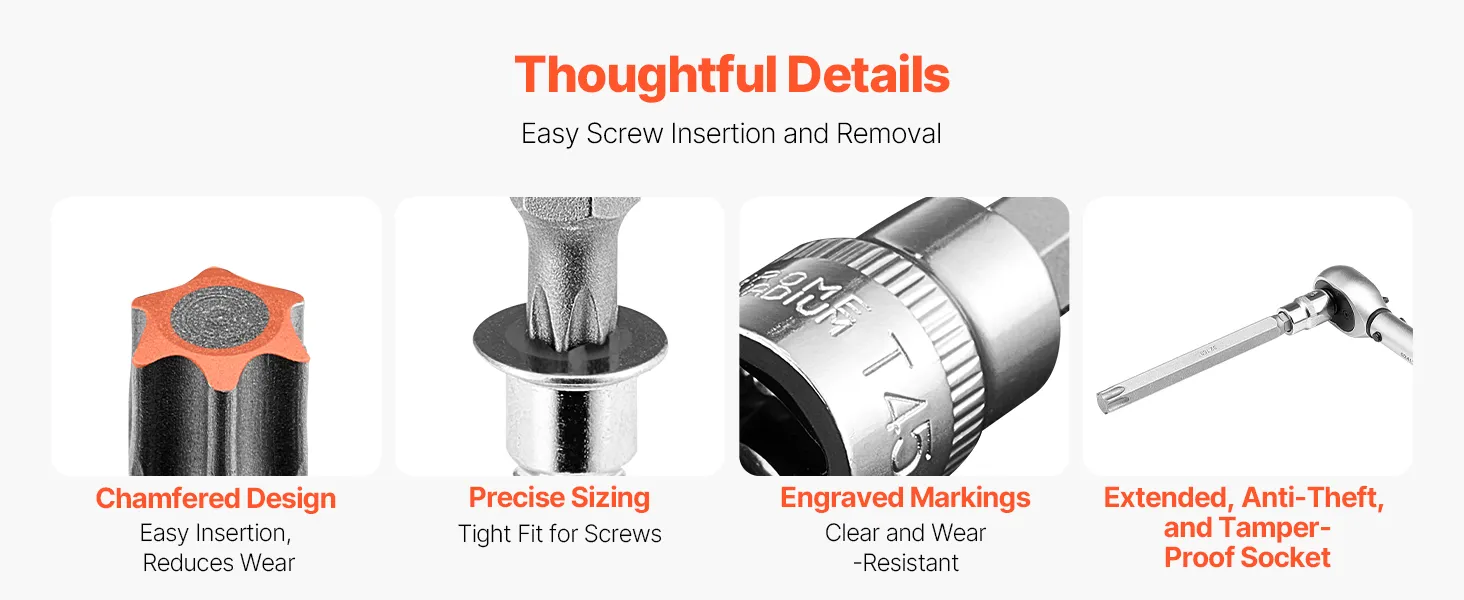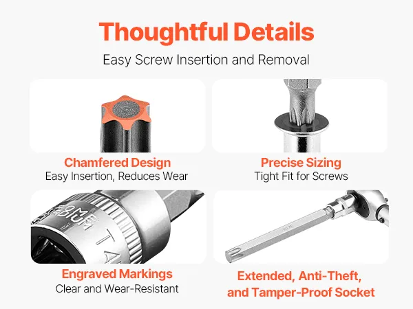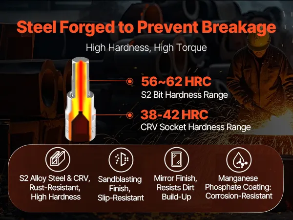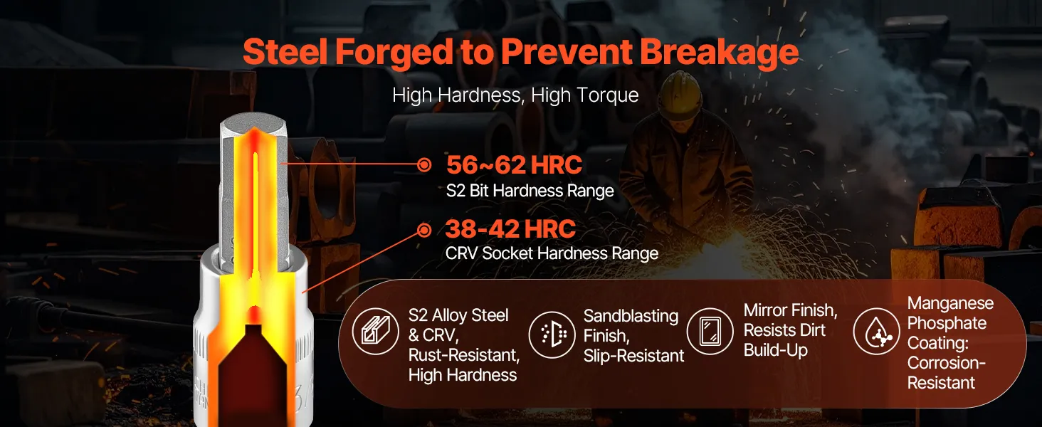 A prueba de óxido y duradero: Construido con acero de aleación S2 de alta dureza y acero cromado CRV, las superficies del juego de dados de punta Torx cuentan con chorro de arena y pulido de espejo, mientras que los dados tipo E se someten a un ennegrecimiento de fosfato de manganeso para una mayor resistencia a la corrosión, lo que garantiza años de uso confiable