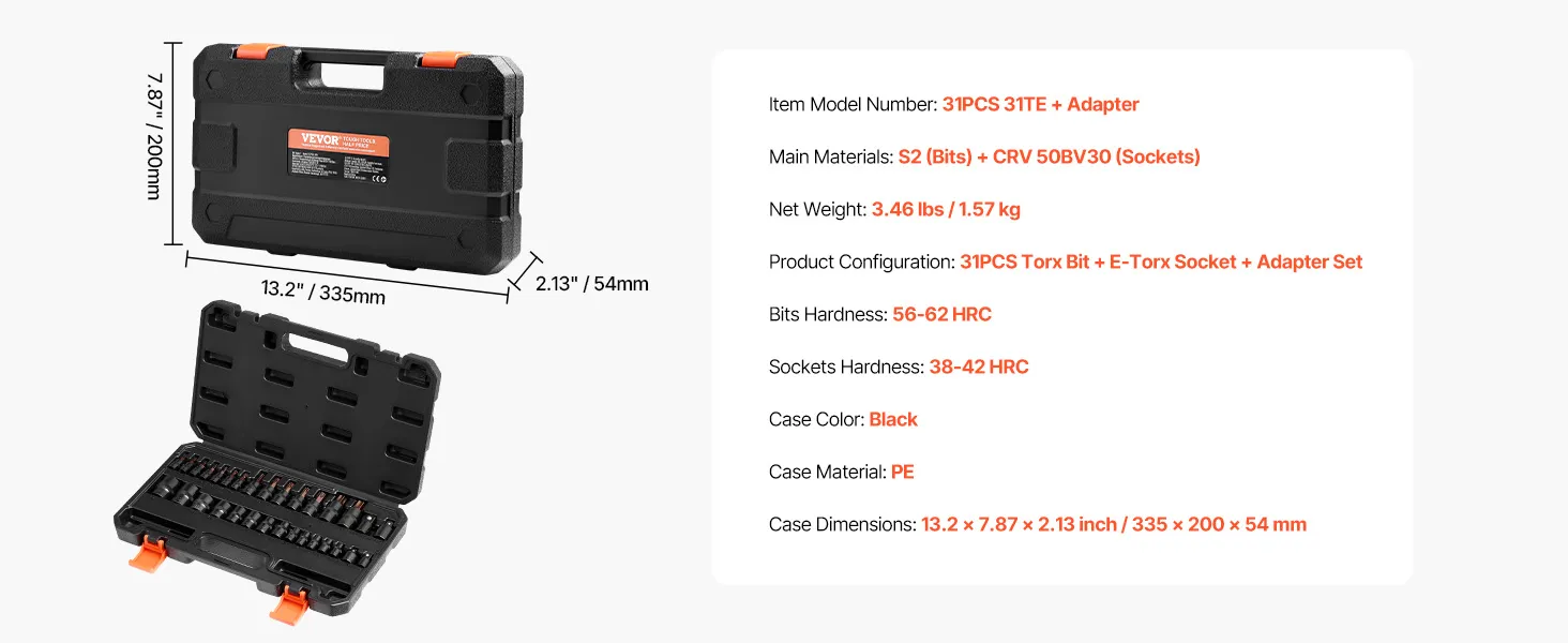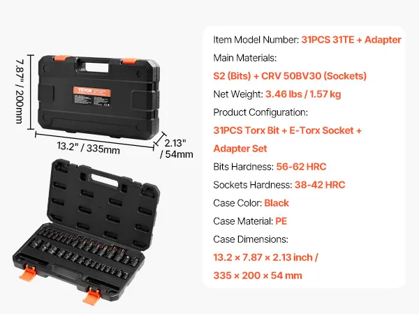 VEVOR 31 PCS Juego de Vasos Torx y Vasos Torx Externos, T8-T70 y E4-E24, Acero de Aleación S2 y Acero Cr-V, Impulsores de 1/4", 3/8" y 1/2", con Adaptador y Estuche de Almacenamiento Mejorado