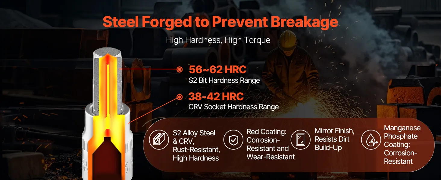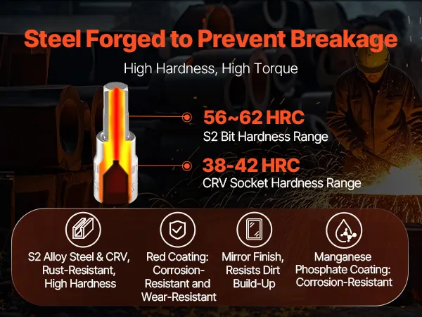 A prueba de óxido y duradero: Construido con acero de aleación S2 de alta dureza y acero cromado CRV, las superficies del juego de dados con punta Torx cuentan con un revestimiento rojo y ennegrecimiento de fosfato de manganeso para una mayor resistencia a la corrosión, lo que garantiza años de uso confiable