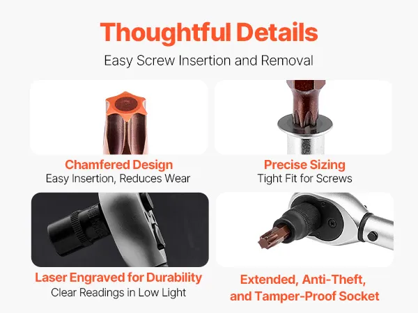 El diseño de borde biselado garantiza una inserción suave, lo que reduce el desgaste y extiende la vida útil del juego de dados Allen. Con un tamaño preciso para un ajuste seguro con varios tipos de tornillos, lo que permite una identificación rápida y fácil.