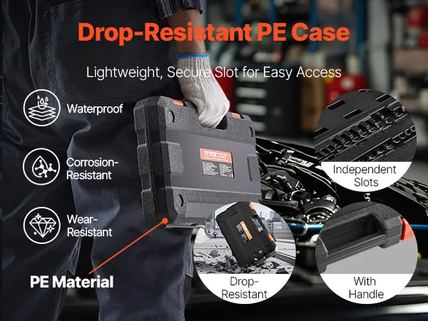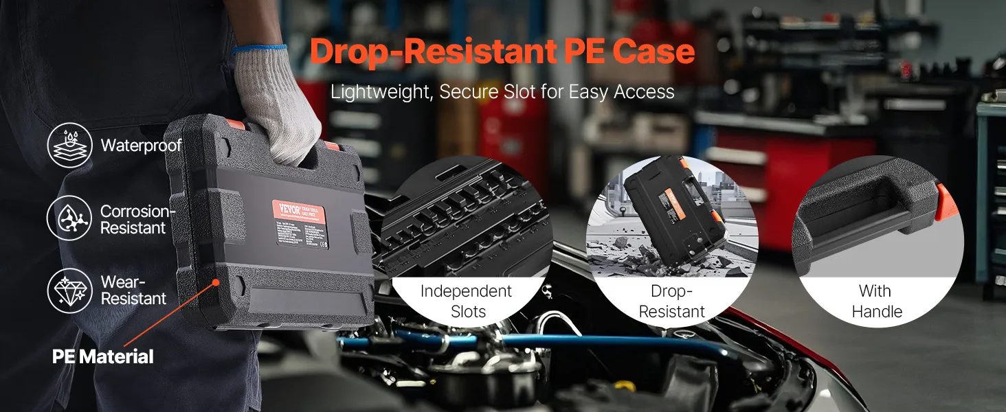 No se preocupe más por caídas accidentales o herramientas dispersas. El resistente estuche de almacenamiento de polietileno cuenta con ranuras seguras para cada dado, manteniéndolos firmemente en su lugar para evitar pérdidas o daños.