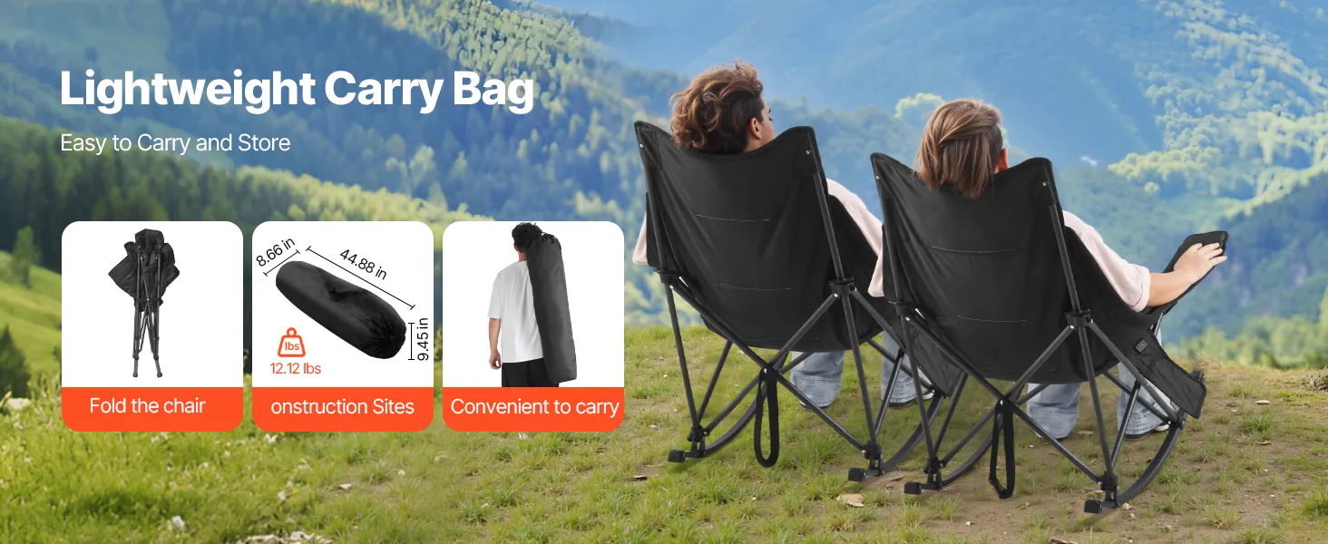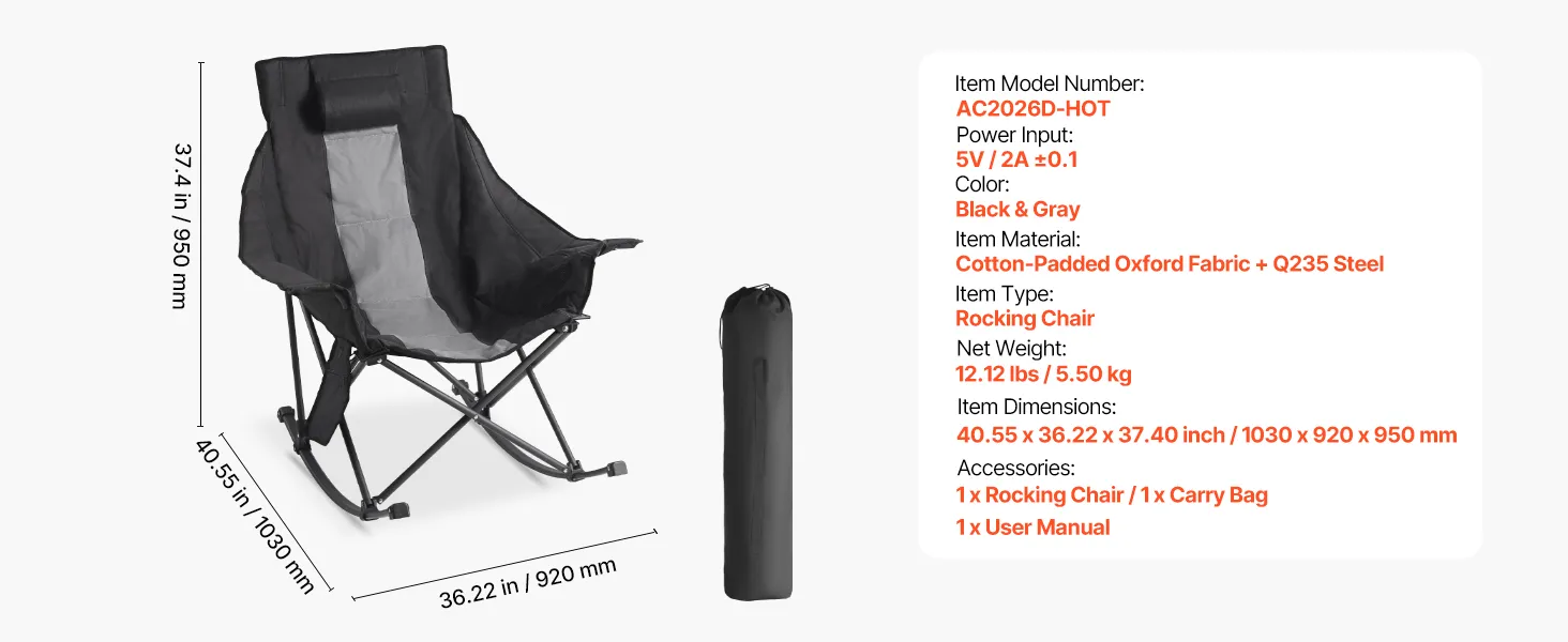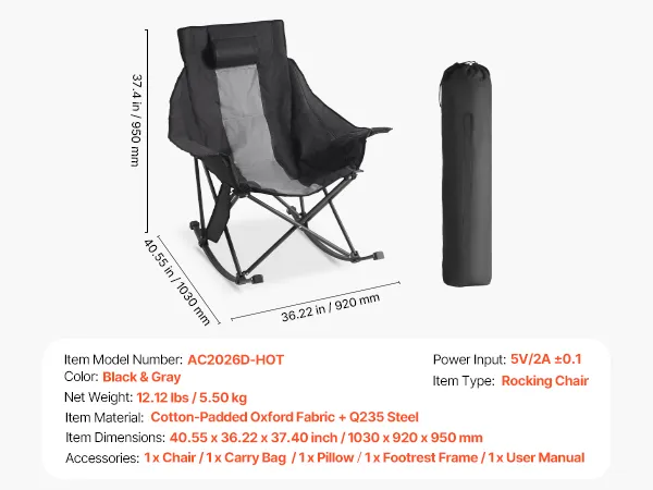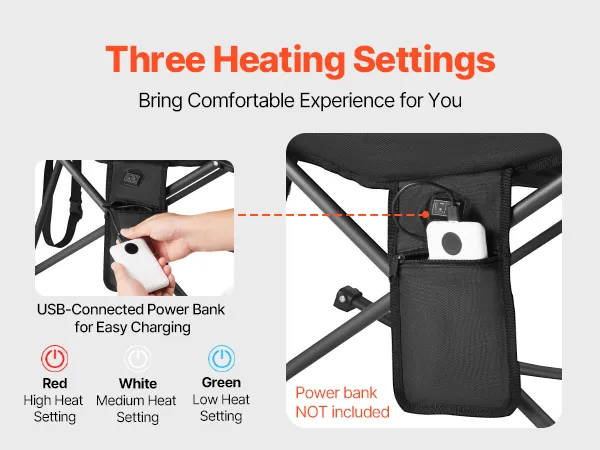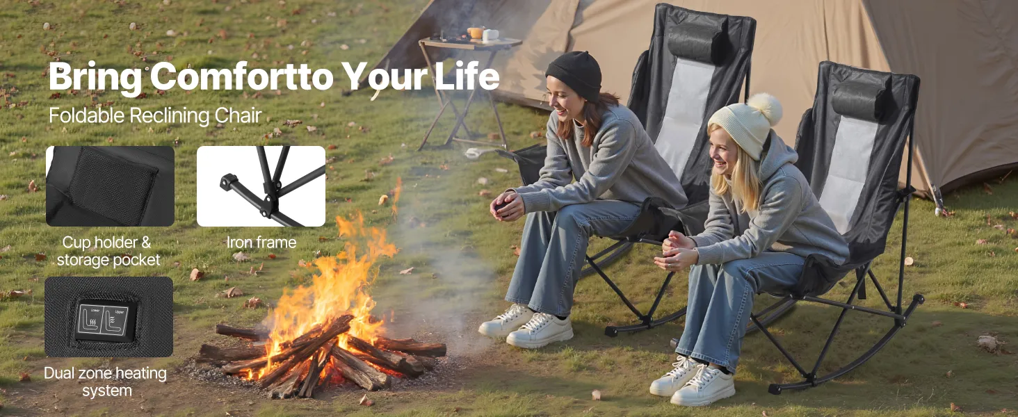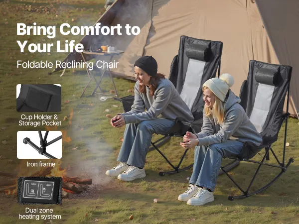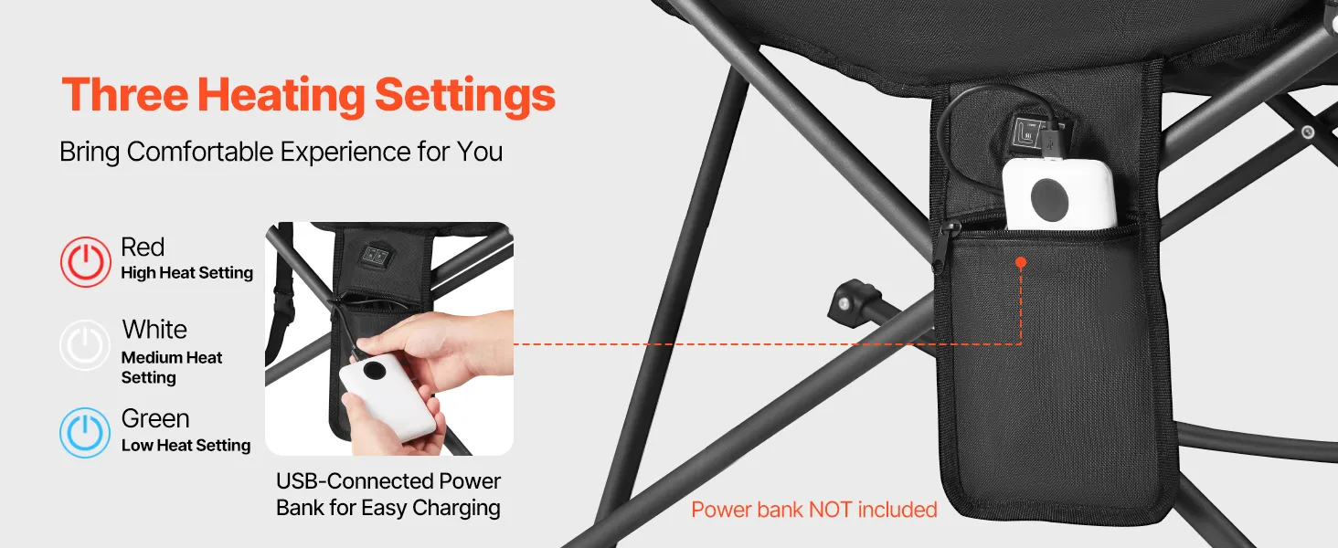 Calefacción de doble zona: Esta mecedora calefactable cuenta con dos zonas de calefacción para una calidez cómoda y personalizada. Ajuste fácilmente la temperatura de la espalda y el asiento para una comodidad óptima, ideal para noches frías y acampadas de invierno.