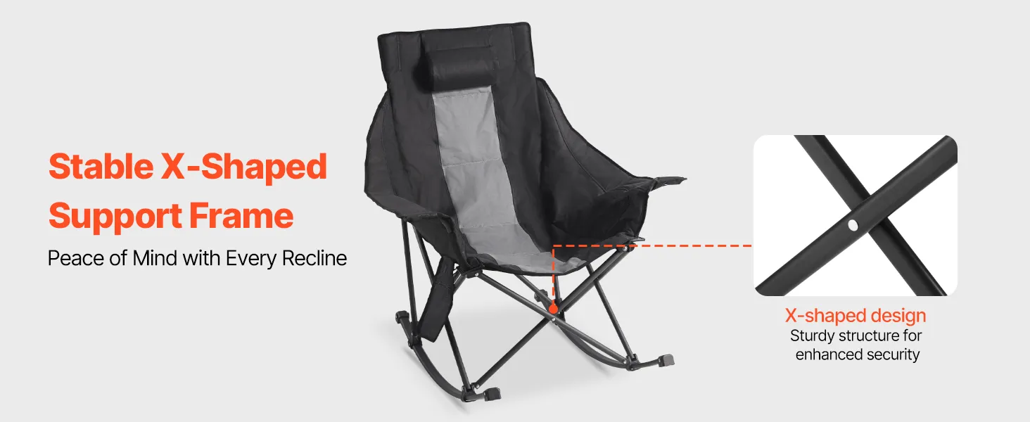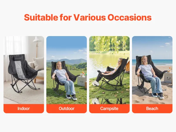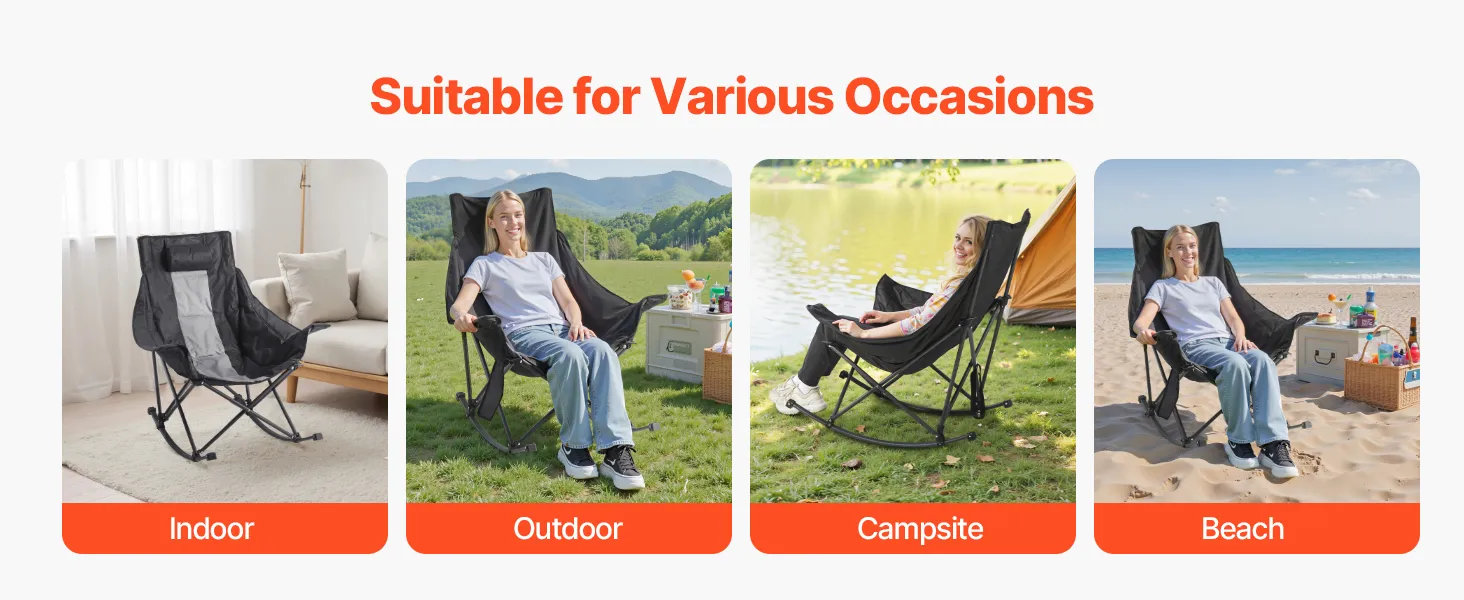 Ideal para acampar, patios, la playa o incluso para relajarse en interiores, esta mecedora está diseñada para adaptarse a una amplia variedad de entornos y brindar una comodidad óptima donde quiera que vaya.
