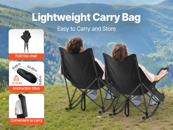 Plegado rápido: Pliega la mecedora de camping en segundos: simplemente tira de las cuatro esquinas hacia adentro, levanta las patas y fíjala con la correa antes de guardarla en su bolsa. No requiere herramientas: fácil de guardar y transportar.