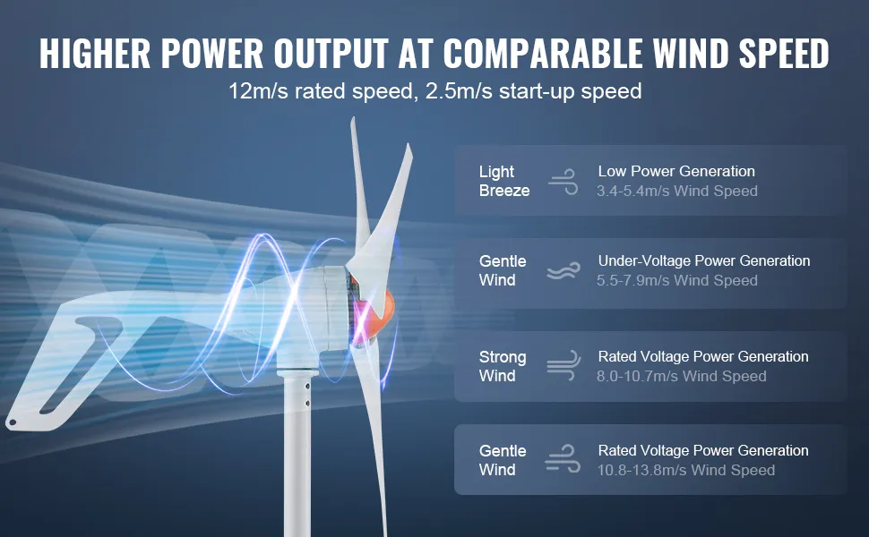 Este diseño maximiza la producción de energía. Las aspas están optimizadas para capturar el viento de manera eficiente. Esto garantiza una salida de energía constante incluso a velocidades de viento más bajas. Además, el diseño de 3 aspas aumenta la durabilidad del generador. Ayuda a mantener el equilibrio y la estabilidad durante el funcionamiento. Por lo tanto, esta característica es importante para mantener una generación de energía constante. La producción de energía eficiente lo convierte en un activo invaluable para cualquier plan de energía. Puede generar electricidad limpia con confianza.