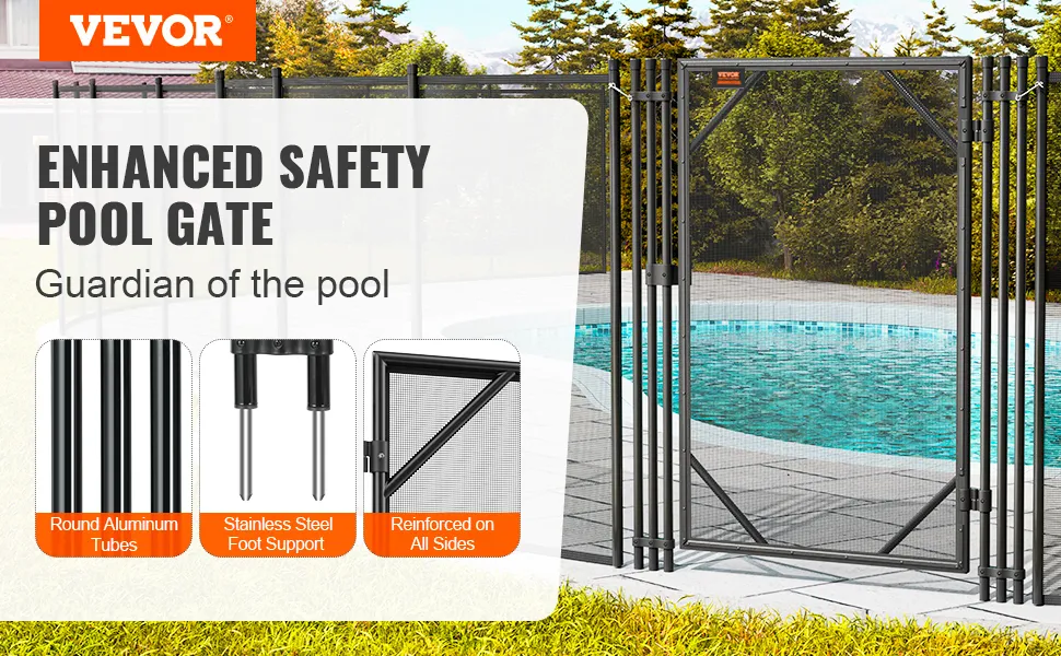 Marco resistente de la puerta de la piscina: La puerta de la cerca de la piscina de diseño exquisito cuenta con postes cuadrados de aluminio de 25,4 mm de espesor y patas de acero inoxidable de 99 mm de largo, lo que proporciona una resistencia a la corrosión y durabilidad superiores para estabilidad y seguridad a largo plazo.