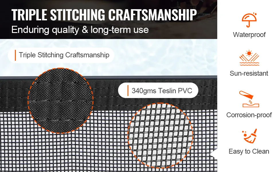 Material de primera calidad: El marco de la barrera de la piscina está construido con tela de malla Teslin de PVC de 340 g, utilizando costuras triples para mejorar la durabilidad, garantizando estética y practicidad.